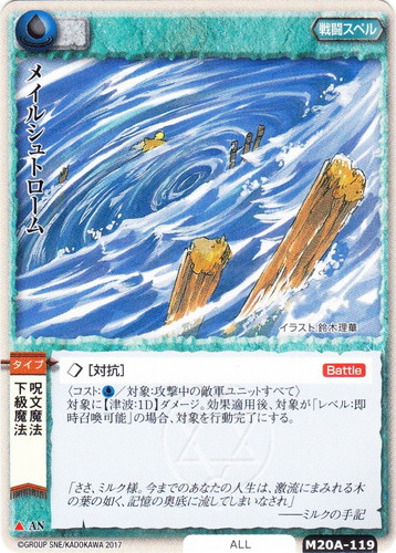 ![]() ![]() | M20A-119 メイルシュトローム 戦闘スペル 太陽の金の竜姫 ▲ 属性:水 ブロック:AN 勢力:ALL タイプ:下級魔法/呪文魔法 ◇[対抗]【Battle】 〈コスト:水/対象:攻撃中の敵軍ユニットすべて〉 対象に【津波:1D】ダメージ。効果適用後、対象が「レベル:即時召喚可能」の場合、対象を行動完了にする。 「ささ、ミルク様。今までのあなたの人生は、激流にまみれる木の葉の如く、記憶の奥底に流してしまいなされ」 ――ミルクの手記 illustrated by 鈴木理華 |