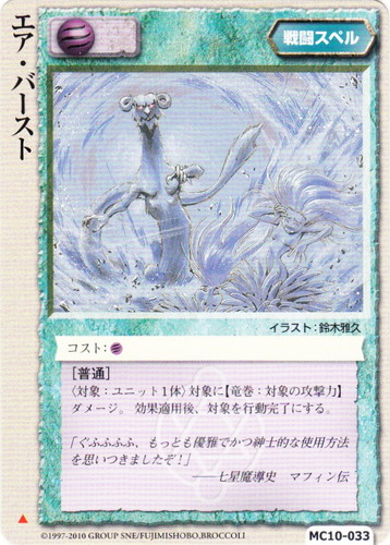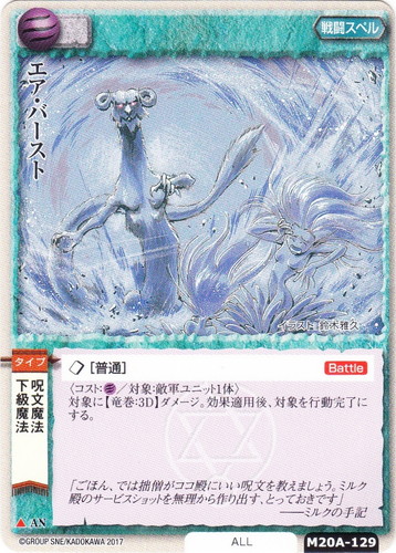 ![]() ![]() | M20A-P12 エア・バースト 戦闘スペル プロモーションカード(20th Anniversary) ▲ 属性:風 ブロック:AN 勢力:ALL タイプ:下級魔法/呪文魔法 ◇[普通]【Battle】 〈コスト:風/対象:敵軍ユニット1体〉 対象に【竜巻:3D】ダメージ。効果適用後、対象を行動完了にする。 「で、キミはいったいなにをしたかったわけ?」 「いや、マフィンのおっさんが言うにはこの呪文で・・・・・・」 ――ミルクの手記 illustrated by 今野隼史 |