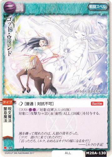 ![]() ![]() | M20A-130 ゴッド・ウィンド 戦闘スペル 太陽の金の竜姫 ◆ 属性:風 ブロック:AN 勢力:ALL タイプ:禁忌魔法/呪文魔法 ◇[普通|対抗不可]【Battle】 〈コスト:風風/対象:自軍ユニット1体〉 対象に「攻撃力:+2D」&「耐性:ALL(10減)」を付与する。 風を纏って現れたのは、人狼の青年だった。 「ココ!助けに来てくれたの!?」 「言っただろ、ミルク。おめえはオイラの嫁になる女だ!」 ――ミルクの手記 illustrated by ぽぽるちゃ |