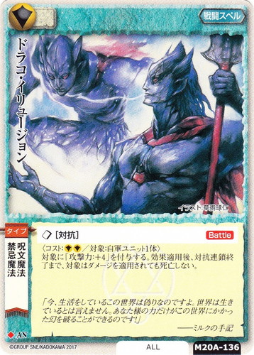 ![]() ![]() | M20A-136 ドラコ・イリュージョン 戦闘スペル 太陽の金の竜姫 ◆ 属性:聖 ブロック:AN 勢力:ALL タイプ:禁忌魔法/呪文魔法 ◇[対抗]【Battle】 〈コスト:聖聖/対象:自軍ユニット1体〉 対象に「攻撃力:+4」を付与する。効果適用後。対抗連鎖終了まで、対象はダメージを適用されても死亡しない。 「今、生活をしているこの世界は偽りなのですよ。世界は生きているとは言えません。あなた様の力だけがこの世界にかかった幻を破ることができるのです!」 ――ミルクの手記 illustrated by 草彅琢仁 |