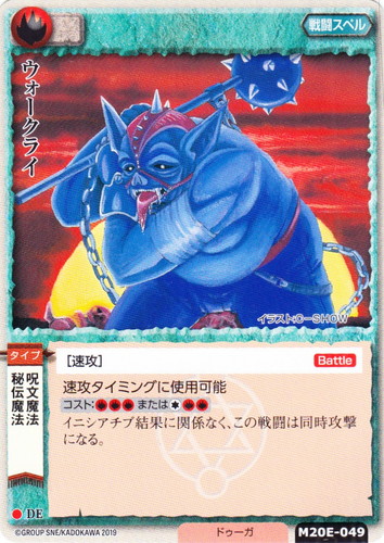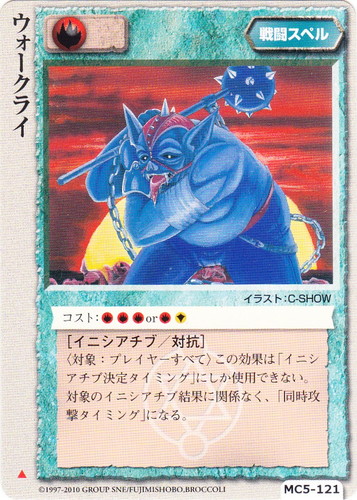 ![]() ![]() | ウォークライ 戦闘スペル モンスター・コレクション ▲ 属性:火 [対抗:イニシアチブ限定] イニシアチブ決定の結果に関係なく、その戦闘を「同時攻撃タイミング」にする。 illustrated by C-Show |