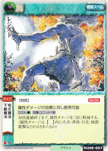 ![]() ![]() | M20E-057 レジスト 戦闘スペル モンスター・コレクションDeus ● 属性:土 種族:下級魔法/呪文魔法 ブロック:DE 勢力:アラシャ [対抗]【Battle】 属性ダメージの効果に対し使用可能 コスト:土 対象:ユニット1体 対抗連鎖終了まで、属性ダメージを「2D」軽減する。(属性ダメージは、【 】内に火炎・津波・石化・地震・電撃などが示されたもの) illustrated by 鈴木雅久 |
