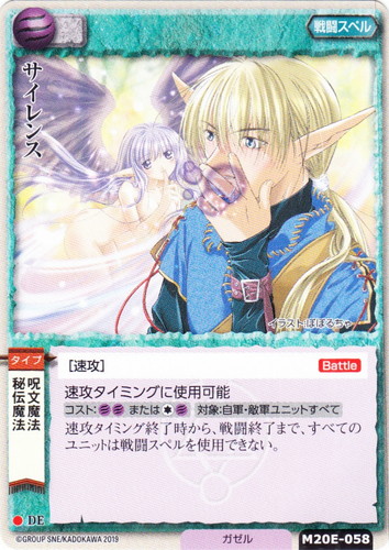 ![]() ![]() | M20E-058 サイレンス 戦闘スペル モンスター・コレクションDeus ● 属性:風 種族:秘伝魔法/呪文魔法 ブロック:DE 勢力:ガゼル [速攻]【Battle】 速攻タイミングに使用可能 コスト:風風または(*)風 対象:自軍・敵軍ユニットすべて 速攻タイミング終了時から、戦闘終了まで、すべてのユニットは戦闘スペルを使用できない。 illustrated by ぽぽるちゃ |