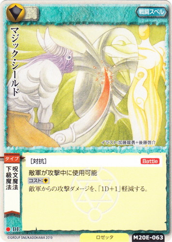![]() ![]() | M20E-063 マジック・シールド 戦闘スペル モンスター・コレクションDeus ● 属性:聖 種族:下級魔法/呪文魔法 ブロック:DE 勢力:ロゼッタ [対抗]【Battle】 敵軍が攻撃中に使用可能 コスト:聖 敵軍からの攻撃ダメージを、「1D+1」軽減する。 illustrated by 加藤龍勇+後藤啓介 |