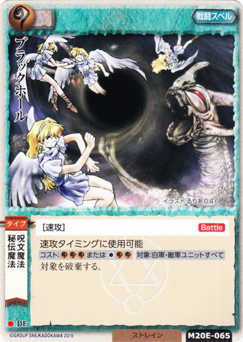 ![]() ![]() | M20E-065 ブラックホール 戦闘スペル モンスター・コレクションDeus ● 属性:魔 種族:秘伝魔法/呪文魔法 ブロック:DE 勢力:ストレイン [速攻]【Battle】 速攻タイミングに使用可能 コスト:魔魔魔または(*)魔魔 対象:自軍・敵軍ユニットすべて 対象を破棄する。 illustrated by るりあ046 |