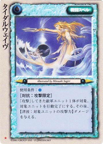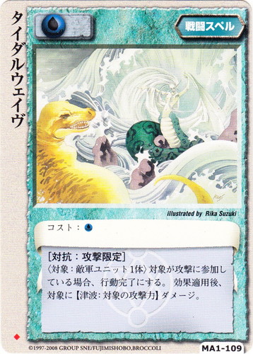 ![]() ![]() | タイダルウェイヴ 戦闘スペル モンスター・コレクション ★ 属性:水 [対抗:攻撃限定] 「攻撃」してきたユニット1体の「攻撃」を打ち消して、行動完了にする。その後【津波:対象ユニットの攻撃力と同じだけ】のダメージを、対象ユニットに与える。 illustrated by Kenji Tsuruta |