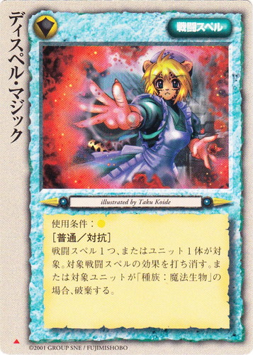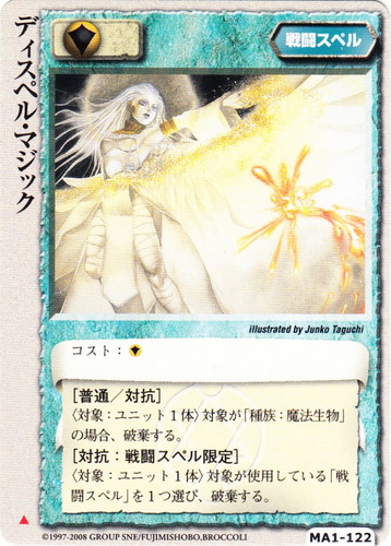 ![]() ![]() | ディスペル・マジック 戦闘スペル モンスター・コレクション ▲ 属性:聖 [普通/対抗] 使用される「戦闘スペル」1つの効果を打ち消す。または「種族:魔法生物」のユニット1体を破棄する。 illustrated by Hiroki Haritama |