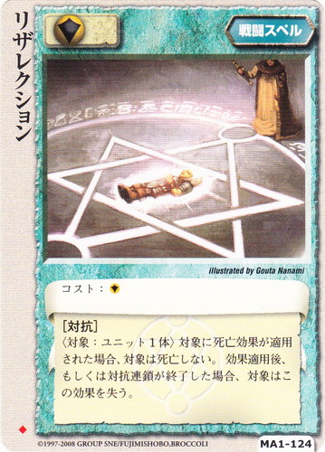 ![]() ![]() | リザレクション 戦闘スペル モンスター・コレクション ◆ 属性:聖 [対抗:死亡限定] 死亡したユニット1体を、死亡しなかったことにする。 illustrated by Gouta Nanami |