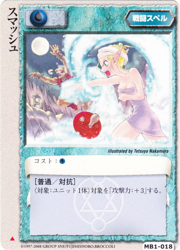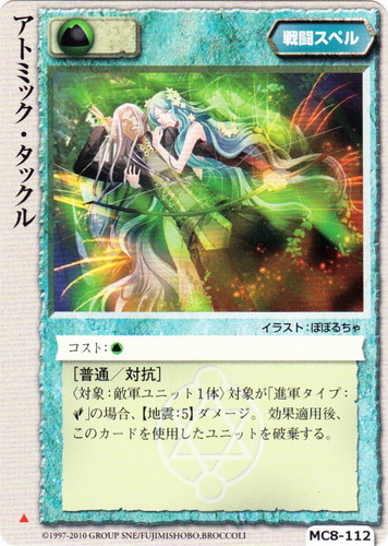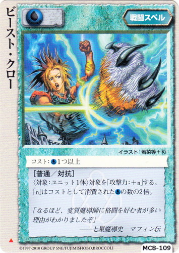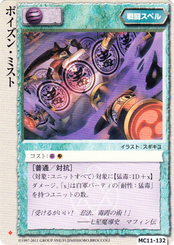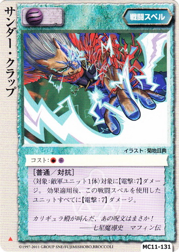 ![]() ![]() | ブースター 戦闘スペル 魔道士の黙示録 ◆ 属性:土 [対抗:ダメージ限定] 1つの戦闘スペルから発生するダメージに効果。対象のダメージを【×2】する。効果の対象が複数の場合、そのすべてを【×2】する。 illustrated by Junko Taguchi |