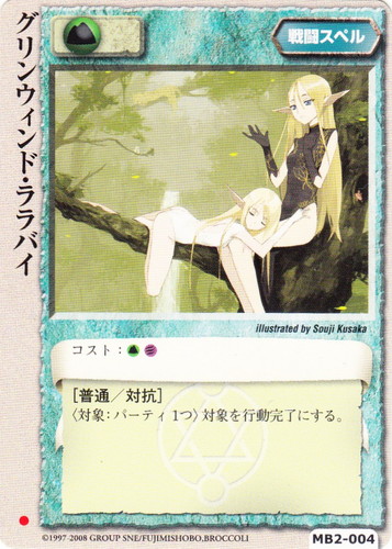 ![]() ![]() | スリパリー 戦闘スペル 魔道士の黙示録 ◆ 属性:土 [普通/対抗] すべてのユニットに効果。対象ユニットが「イニシアチブ:+X」を持っている場合、行動完了にする。 「わーい、お馬さんは転んじゃうですぅ」突撃してきたケンタウロス。リーフが呪文で彼らを止めた。 「今夜は馬刺しですかな」カオスがゴクリと唾を飲む。 「おいおい」あきれ顔のボルカノ。 ――ホーリィの手記 illustrated by Hiroyuki Ishida |