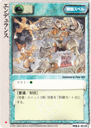 ![]() ![]() | M20A-124 エンデュランス 戦闘スペル 太陽の金の竜姫 ▲ 属性:土 ブロック:AN 勢力:ALL タイプ:上級魔法/呪文魔法 ◇[普通/対抗]【Battle】 〈コスト:土/対象:自軍ユニット1体〉 対象に「防御力:+1D」または「ディフェンダー:+4」を付与する。 ◇[普通/対抗]Dual【Battle】 〈コスト:土土/対象:自軍ユニット1体〉 対象に「防御力:+2D」または「ディフェンダー:+8」を付与する。 illustrated by 中村哲也 |