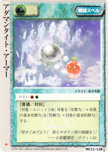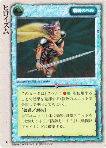 ![]() ![]() | ヒロイズム 戦闘スペル 魔道士の黙示録 ★ 属性:土 このカードは「スペル:火土」を使用することで効果を発揮する(複数のユニットで分担して使用してもよい)。 [普通/対抗] 自軍ユニット1体に効果。対象ユニットを「攻撃力:+3/防御力:+3」し、戦闘終了タイミングに破棄する。 illustrated by Hikaru Tanaka |