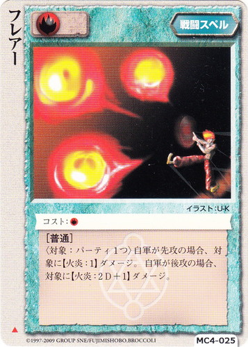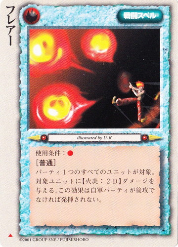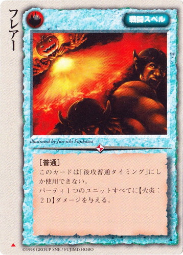 ![]() ![]() | フレアー 戦闘スペル 魔道士の黙示録 ▲ 属性:火 [普通] このカードは「後攻普通タイミング」にしか使用できない。 パーティ1つのユニットすべてに【火炎:2D】ダメージを与える。 illustrated by Jun-ichi Fujikawa |