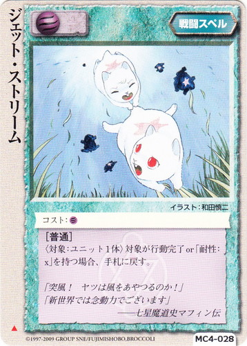 ![]() ![]() | アクア・ストリーム 戦闘スペル 魔道士の黙示録 ▲ 属性:水 [対抗:戦闘スペル限定] このカードは[対抗]で使用された戦闘スペルに対しては使用できない。 戦闘スペル1つに効果。その戦闘スペルの対象が「ユニット1体」の場合、対象となるユニットを変更できる。新たな対象は、このカードを使用したプレイヤーが指定する。 illustrated by Rika Suzuki |