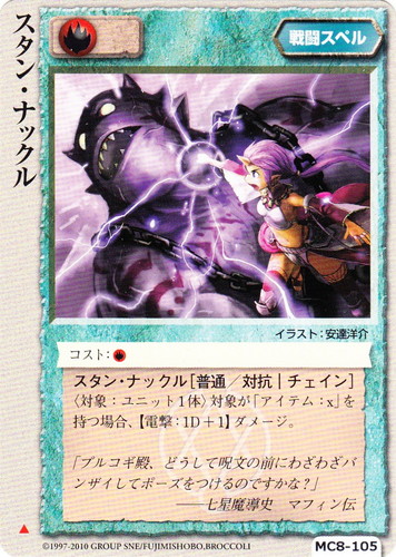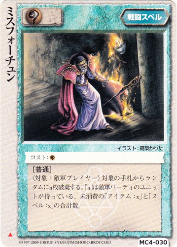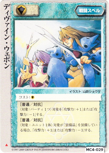 ![]() ![]() | イクイップメント 戦闘スペル 魔道士の黙示録 ◆ 属性:火 [普通] 自軍ユニット1体に効果。対象ユニットに自分の手札にある「アイテム(装備品)」を1つだけ装備させる。この効果では「アイテム:X」を使用することはなく、対象ユニットに「アイテム:X」がなくてもよい。この効果で装備された装備品は、戦闘終了タイミングに破棄される。 illustrated by Hiroki Haritama |