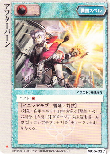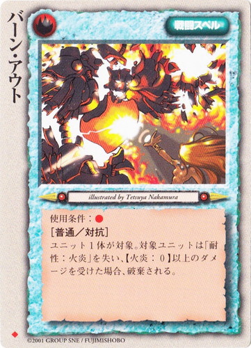 ![]() ![]() | バーン・アウト 戦闘スペル 魔道士の黙示録 ▲ 属性:火 [対抗:ダメージ限定] ダメージを受けるユニット1体に効果。対象ユニットの受けるダメージが【火炎】の場合、対象ユニットを破棄する。 illustrated by Shinji Wada |