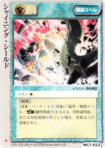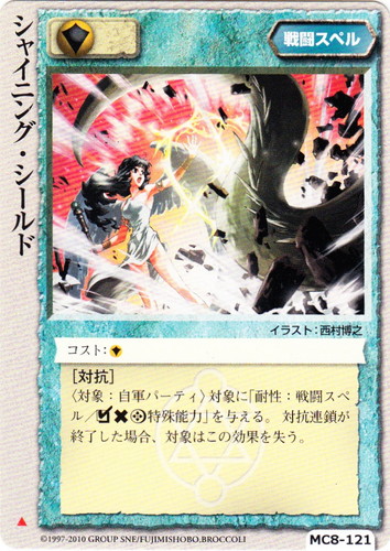 ![]() ![]() | シールド 戦闘スペル モンスター・コレクション ▲ 属性:土 [普通/対抗] パーティ1つのすべてのユニットを、「防御力:+1」する。 illustrated by Yuuya Kobayashi |