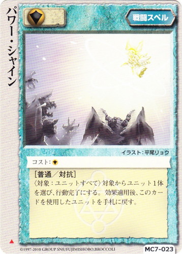 ![]() ![]() | パワー・アブソーバー 戦闘スペル モンスター・コレクション ▲ 属性:魔 [対抗:攻撃限定] 「攻撃」してきたすべてのユニットを、「攻撃力:-2」する。 illustrated by Toshihisa Tanaka |