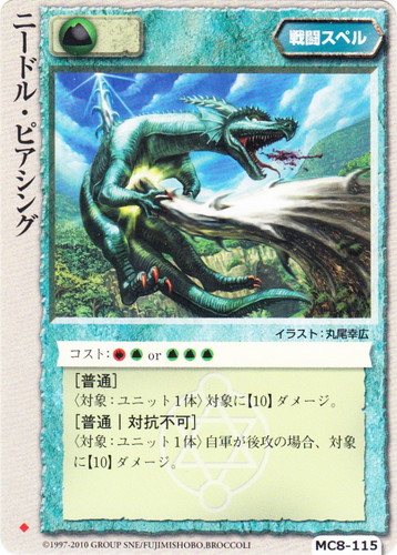 ![]() ![]() | GE3-055 ピアーシングスピア 戦闘スペル ゴッドイーターバースト ★(箔押し) 属性:機 ブロック:GE タイプ:スペル ◇[普通/対抗]ピアーシングスピア 〈コスト:荒機消費/対象:敵軍ユニット1体〉 対象に【火:5】ダメージ。効果適用後、対象に「攻撃力:-5」を付与する。 鋭利な針に炎をまとわせ高速で繰り出しその熱と速度でいかなる装甲も貫き通す一撃。 illustrated by アオガチョウ |