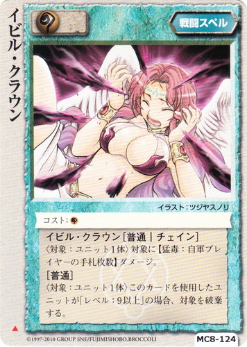 ![]() ![]() | カース・サークル 戦闘スペル モンスター・コレクション ★ 属性:魔 [普通/対抗] ユニット1体を「属性:魔」に変更する。対象ユニットがもとから「属性:魔」の場合、「防御力」を「レベル」と同じ値に変更する。 illustrated by Jun-ichi Fujikawa |