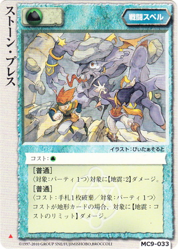 ![]() ![]() | ストーン・ブラスト 戦闘スペル モンスター・コレクション ◆ 属性:土 [普通] 「属性:土」以外のすべてのユニットに、【地震:4】ダメージを与える。 illustrated by C-Show |