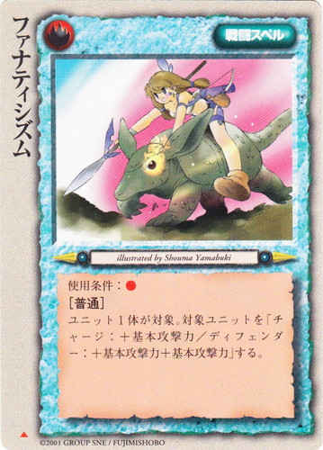 ![]() ![]() | M20E-051 ファナティシズム 戦闘スペル モンスター・コレクションDeus ● 属性:火 種族:下級魔法/呪文魔法 ブロック:DE 勢力:ドゥーガ [対抗]【Battle】 自軍が攻撃中に使用可能 コスト:火 対象:ユニット1体 戦闘終了まで、「攻+1D+1」。 illustrated by 山吹ショウマ |