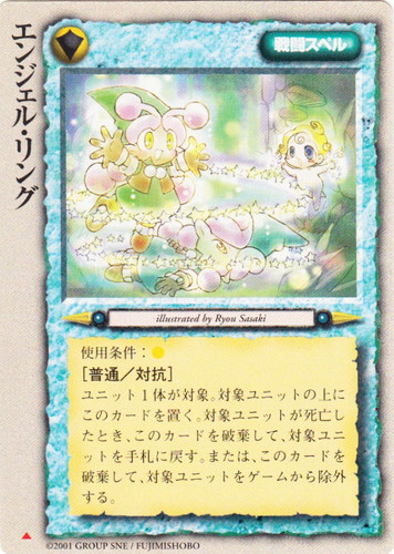![]() ![]() | エンジェル・リング 戦闘スペル 魔道士の黙示録 ◆ 属性:聖 [対抗:死亡限定] 死亡したユニット1体に効果。対象ユニットを、そのプレイヤーの手札に戻すか、ゲームから除外する。 illustrated by Hiroyuki Katou&Keisuke Gotou |