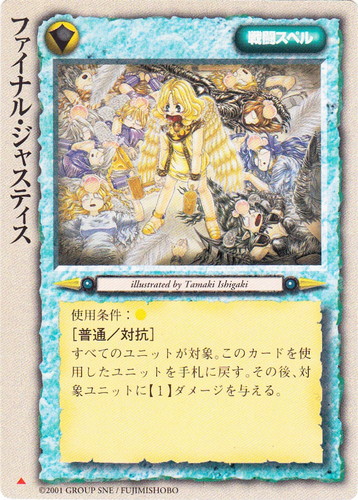 ![]() ![]() | ファイナル・ジャスティス 戦闘スペル 古代帝国の遺産 ◆ 属性:聖 [普通/対抗] これを使用したユニットを手札に戻す。その後、すべてのユニットに【1】ダメージを与える。 illustrated by Tamaki Ishigaki |