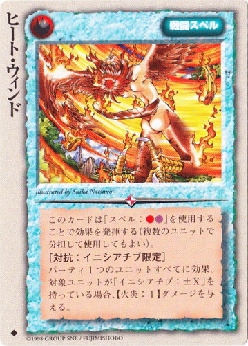 ![]() ![]() | ヒート・ウィンド 戦闘スペル 魔道士の黙示録 ◆ 属性:火 このカードは「スペル:火風」を使用することで効果を発揮する(複数のユニットで分担して使用してもよい)。 [対抗:イニシアチブ限定] パーティ1つのユニットすべてに効果。対象ユニットが「イニシアチブ:±X」を持っている場合、【火炎:1】ダメージを与える。 illustrated by Suika Natsuno |