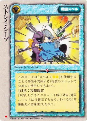 ![]() ![]() | ストレイ・シープ 戦闘スペル 魔道士の黙示録 ◆ 属性:聖 このカードは「スペル:聖聖」を使用することで効果を発揮する(複数のユニットで分担して使用してもよい)。 [対抗:攻撃限定] 「攻撃」してきたユニット1体に効果。対象ユニットは行動完了となり、すべての「常備能力/特殊能力」を失う。 illustrated by Haruko Iida |
