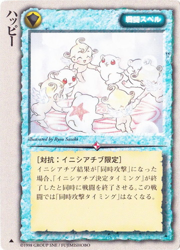 ![]() ![]() | ハッピー 戦闘スペル 魔道士の黙示録 ▲ 属性:聖 [対抗:イニシアチブ限定] イニシアチブ結果が「同時攻撃」になった場合、「イニシアチブ決定タイミング」が終了したと同時に戦闘を終了させる。この戦闘では「同時攻撃タイミング」はなくなる。 illustrated by Ryou Sasaki |
