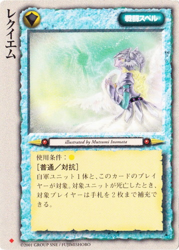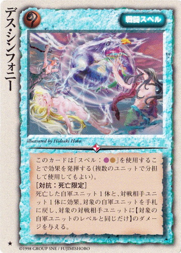 ![]() ![]() | デス・シンフォニー 戦闘スペル 魔道士の黙示録 ★ 属性:魔 このカードは「スペル:風魔」を使用することで効果を発揮する(複数のユニットで分担して使用してもよい)。 [対抗:死亡限定] 死亡した自軍ユニット1体と、対戦相手ユニット1体に効果。対象の自軍ユニットを手札に戻し、対象の対戦相手ユニットに【対象の自軍ユニットのレベルと同じだけ】のダメージを与える。 illustrated by Hideaki Hoba |