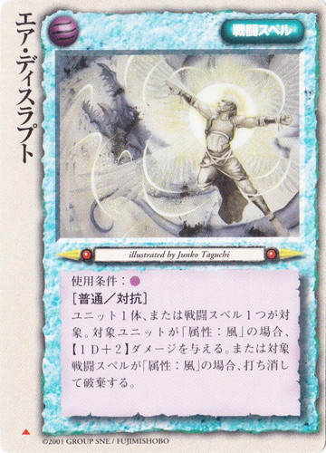 ![]() ![]() | エア・サークル 戦闘スペル モンスター・コレクション ★ 属性:風 [普通/対抗] ユニット1体を「属性:風」に変更する。対象ユニットがもとから「属性:風」の場合、「防御力:×2」する。 illustrated by Jun-ichi Fujikawa |
