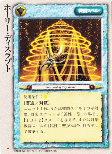 ![]() ![]() | ホーリー・ストライク 戦闘スペル モンスター・コレクション ★ 属性:聖 [普通] パーティ1つの「種族:アンデッド」のユニットすべてを、破棄する。 illustrated by Chouji Maboroshi |