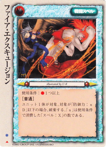 ![]() ![]() | エクスキュージョン 戦闘スペル 魔道士の黙示録 ◆ 属性:魔 このカードは「スペル:火魔」を使用することで効果を発揮する(複数のユニットで分担して使用してもよい)。 [普通] ユニット1体に効果。対象ユニットを戦闘終了タイミングに破棄する。 illustrated by Jun-ichi Fujikawa |