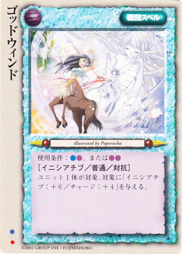 ![]() ![]() | チャージング・ウィンド 戦闘スペル モンスター・コレクション ★ 属性:風 [普通] パーティ1つのすべてのユニットに、「チャージ」を与える。 illustrated by Junko Taguchi |