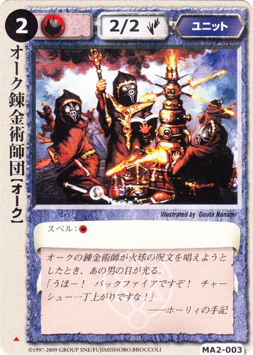 ![]() ![]() | MA2-003 オーク錬金術師団 ユニット 千年皇国の栄光 ▲ 属性:火 種族:オーク レベル:(2) 攻撃力:2 防御力:2 進軍タイプ:歩行 スペル:火 オークの錬金術師が火球の呪文を唱えようとしたとき、あの男の目が光る。 「うほー!バックファイアですぞ!チャーシュー一丁上がりですな!」 ――ホーリィの手記 illustrated by Gouta Nanami |