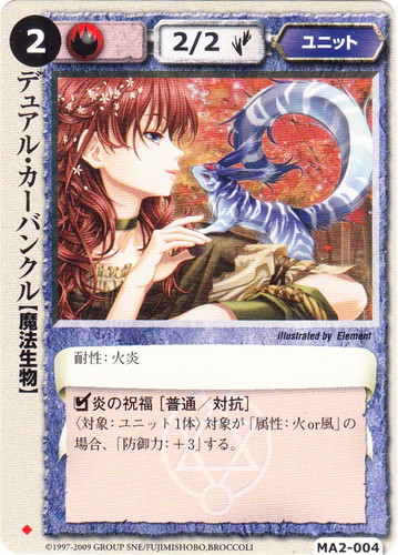 ![]() ![]() | MA2-004 デュアル・カーバンクル ユニット 千年皇国の栄光 ◆ 属性:火 種族:魔法生物 レベル:(2) 攻撃力:2 防御力:2 進軍タイプ:歩行 耐性:火炎 □炎の祝福[普通/対抗] 〈対象:ユニット1体〉対象が「属性:火or風」の場合、「防御力:+3」する。 illustrated by Element |