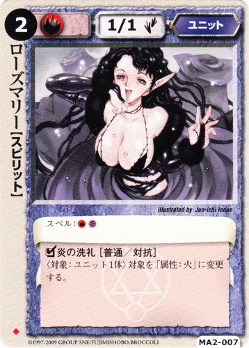 ![]() ![]() | MA2-007 ローズマリー ユニット 千年皇国の栄光 ◆ 属性:火 種族:スピリット レベル:(2) 攻撃力:1 防御力:1 進軍タイプ:歩行 スペル:火風 □炎の洗礼[普通/対抗] 〈対象:ユニット1体〉対象を「属性:火」に変更する。 illustrated by Jun-ichi Fujikawa |