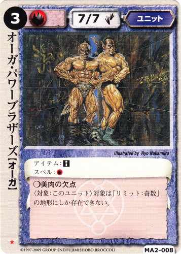 ![]() ![]() | MA2-008 オーガ・パワー・ブラザーズ ユニット 千年皇国の栄光 ★ 属性:火 種族:オーガ レベル:(3) 攻撃力:7 防御力:7 進軍タイプ:歩行 アイテム:■ スペル:火 ○美肉の欠点 〈対象:このユニット〉対象は「リミット:奇数」の地形にしか存在できない。 illustrated by Ryo Nakamura |