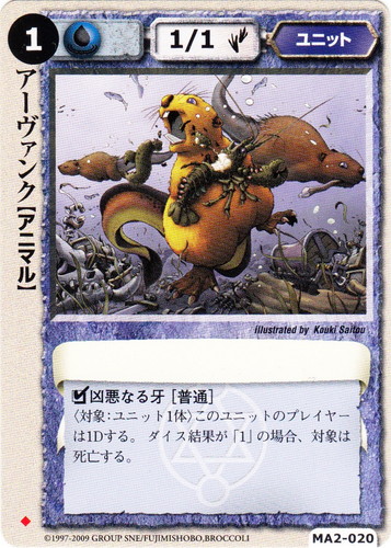 ![]() ![]() | MA2-020 アーヴァンク ユニット 千年皇国の栄光 ◆ 属性:水 種族:アニマル レベル:(1) 攻撃力:1 防御力:1 進軍タイプ:歩行 □凶悪なる牙[普通] 〈対象:ユニット1体〉このユニットのプレイヤーは1Dする。ダイス結果が「1」の場合、対象は死亡する。 illustrated by Kouki Saitou |