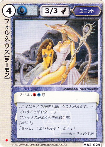 ![]() ![]() | MA2-029 フォルネウス ユニット 千年皇国の栄光 ◆ 属性:水 種族:デーモン レベル:4 攻撃力:3 防御力:3 進軍タイプ:歩行 スペル:火水* 「エイはサメの仲間と聞いたことがあるで。ってことはやな・・・・・・」 アレックスがまたもや鼻息全開。 「なに?」 「きっと、うまいもんや!とう!」 ――ホーリィの手記 illustrated by Yuuko Tsukishiro |
