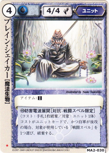 ![]() ![]() | MA2-030 ブレイン・シェイカー ユニット 千年皇国の栄光 ★ 属性:水 種族:魔法生物 レベル:4 攻撃力:4 防御力:4 進軍タイプ:歩行 アイテム:■ ◎妨害電波展開[対抗:戦闘スペル限定] 〈コスト:手札1枚破棄/対象:ユニット1体〉コストがユニットカードで、かつ自軍が後攻の場合、対象が使用している「戦闘スペル」を1つ選び、破棄する。 illustrated by Yuuko Tsukishiro |