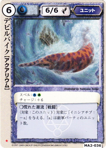 ![]() ![]() | MA2-036 デビルパイク ユニット 千年皇国の栄光 ★ 属性:水 種族:アクアリウム レベル:6 攻撃力:6 防御力:6 進軍タイプ:歩行 スペル:水土 チャージ:+6 ○荒れた潮流[戦闘] 〈対象:このyニット〉対象に「イニシアチブ:-n」を与える。「n」は敵軍パーティのユニット数。 illustrated by Yoshiyasu Tomoe |