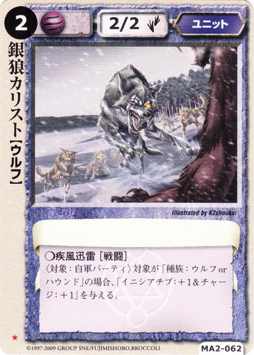 ![]() ![]() | MA2-062 銀狼カリスト ユニット 千年皇国の栄光 ★ 属性:風 種族:ウルフ レベル:(2) 攻撃力:2 防御力:2 進軍タイプ:歩行 ○疾風迅雷[戦闘] 〈対象:自軍パーティ〉対象が「種族:ウルフorハウンド」の場合、「イニシアチブ:+1&チャージ:+1」を与える。 illustrated by K2Shoukai |