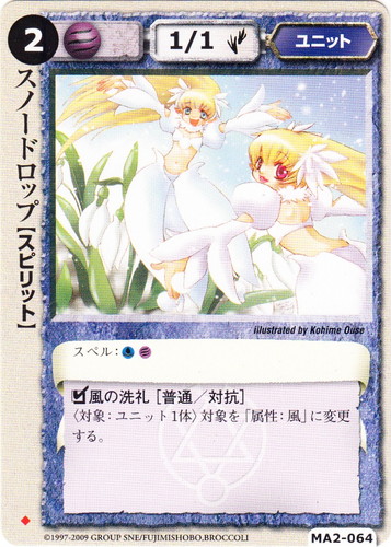 ![]() ![]() | MA2-064 スノー・ドロップ ユニット 千年皇国の栄光 ◆ 属性:風 種族:スピリット レベル:(2) 攻撃力:1 防御力:1 進軍タイプ:歩行 スペル:水風 □風の洗礼[普通/対抗] 〈対象:ユニット1体〉対象を「属性:風」に変更する。 illustrated by Kohime Ohse |
