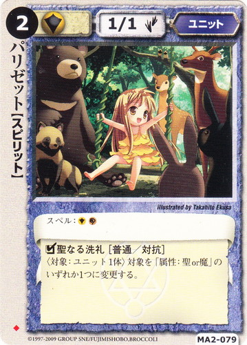 ![]() ![]() | MA2-079 パリゼット ユニット 千年皇国の栄光 ◆ 属性:聖 種族:スピリット レベル:(2) 攻撃力:1 防御力:1 進軍タイプ:歩行 スペル:聖魔 □聖なる洗礼[普通/対抗] 〈対象:ユニット1体〉対象を「属性:聖or魔」のいずれか1つに変更する。 illustrated by Takahito Ekusa |