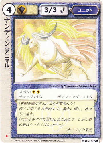 ![]() ![]() | MA2-086 ナンディン ユニット 千年皇国の栄光 ◆ 属性:聖 種族:アニマル レベル:4 攻撃力:3 防御力:3 進軍タイプ:歩行 スペル:聖聖 チャージ:+3 ディフェンダー:+6 「神蛇を継ぐ者よ、よくぞ参られた」 続けて語るその声の主は、黄金に輝く、神々しい雄牛。 「六皇子をすべて封印したのだな?しかし真の敵はヤツらではない・・・・・・」 ――ホーリィの手記 illustrated by Ryoyou Katou&Keisuke Gotou |
