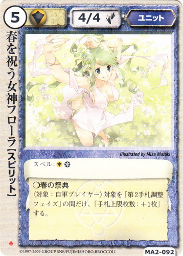 ![]() ![]() | MA2-092 春を祝う女神フローラ ユニット 千年皇国の栄光 ♣ 属性:聖 種族:スピリット レベル:5 攻撃力:4 防御力:4 進軍タイプ:歩行 スペル:聖* ○春の祭典 〈対象:自軍プレイヤー〉対象を「第2手札調整フェイズ」の間だけ、「手札上限枚数:+1枚」する。 illustrated by Misa Matoki |