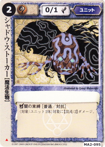 ![]() ![]() | MA2-095 シャドウ・ストーカー ユニット 千年皇国の栄光 ▲ 属性:魔 種族:魔法生物 レベル:(2) 攻撃力:0 防御力:1 進軍タイプ:歩行 □闇の束縛[普通/対抗] 〈対象:ユニット1体〉対象に【混沌:2】ダメージ。 illustrated by Cyouji Maboroshi |